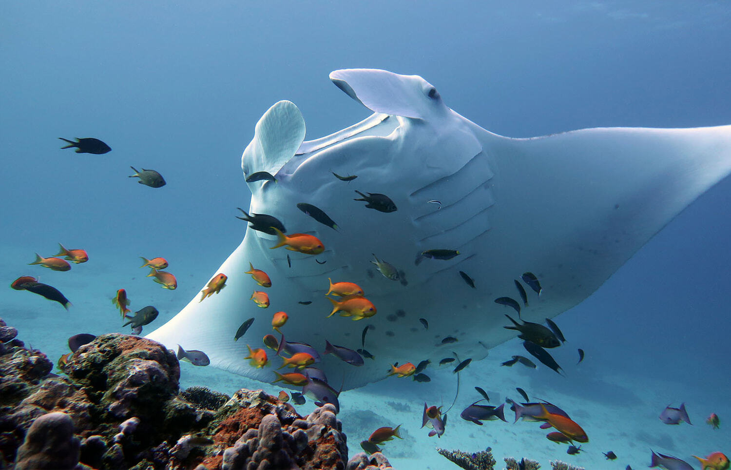 Jednym z ciekawszych i bardziej fascynujących elementów rafy koralowej są tzw. stacje czyszczące. To specjalne miejsca, w których mniejsze ryby, takie jak wargacze lub krewetki czyszczące, specjalizują się w usuwaniu z ciała większych stworzeń martwej skóry, pasożytów czy różnorakich resztek. W tym celu większe ryby, takie jak manty, rekiny, tuńczyki lub żółwie morskie dobrowolnie podpływają do stacji czyszczącej i często przyjmują spokojną, niemal „zamrożoną” pozycję, pozwalając małym pomocnikom wejść im nawet do pysków czy skrzeli.